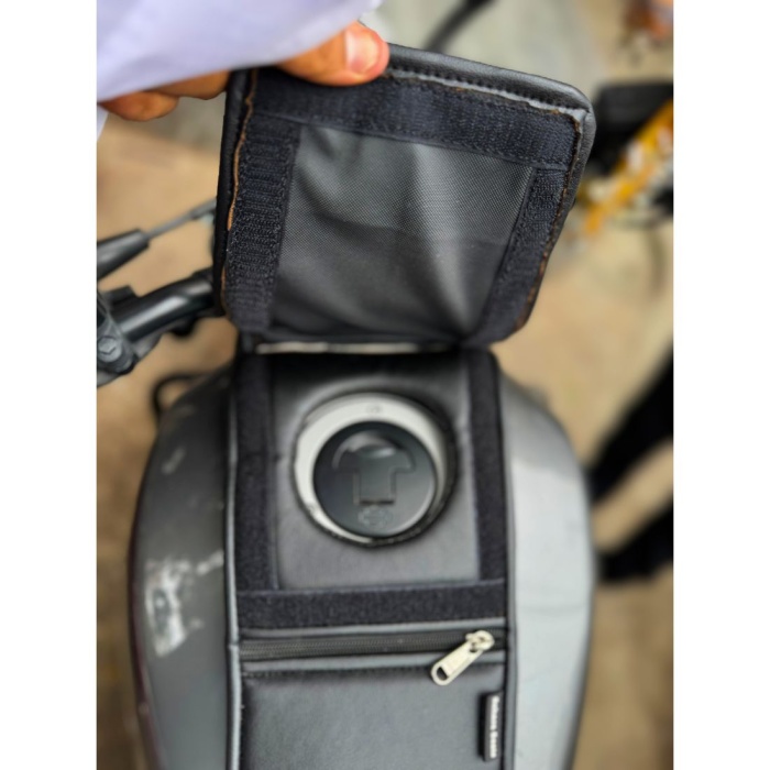 The tank cover protects against scratches and dents, preserving its appearance. It prevents dust and water from contaminating the fuel tank, which ensures optimal performance. Additionally, features like mobile pockets allow for easy access to GPS and apps during rides, while other pockets enhance storage convenience.