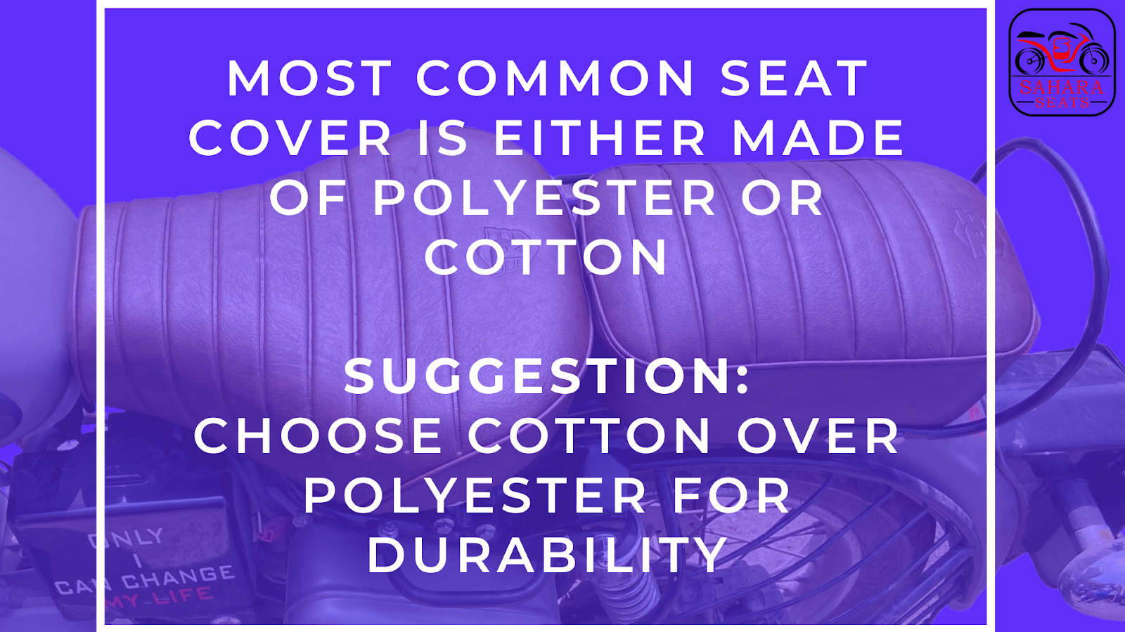 The most commonly used fabrics in the Indian Local Market are Polyester and Cotton made fabrics. Polyester Fabrics are the cheapest ones and medium-hard by default. That means the seat cover will become hard very soon and may start getting crack within months. Cotton made fabrics are slightly costlier than the Polyester seat covers and would give a good life to the seat cover.